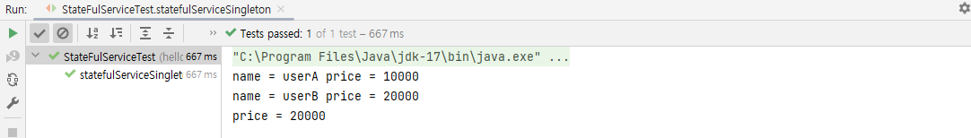 싱글톤 패턴이든, 스프링 같은 싱글톤 컨테이너를 사용하든, 객체 인스턴스를 하나만 생성해서 공유하는 싱글톤 방식은 여러 클라이언트가 하나의 같은 객체 인스턴스를 공유하기 때문에 싱글톤 객체는 상태를 유지(stateful)하게 설계하면 안된다.