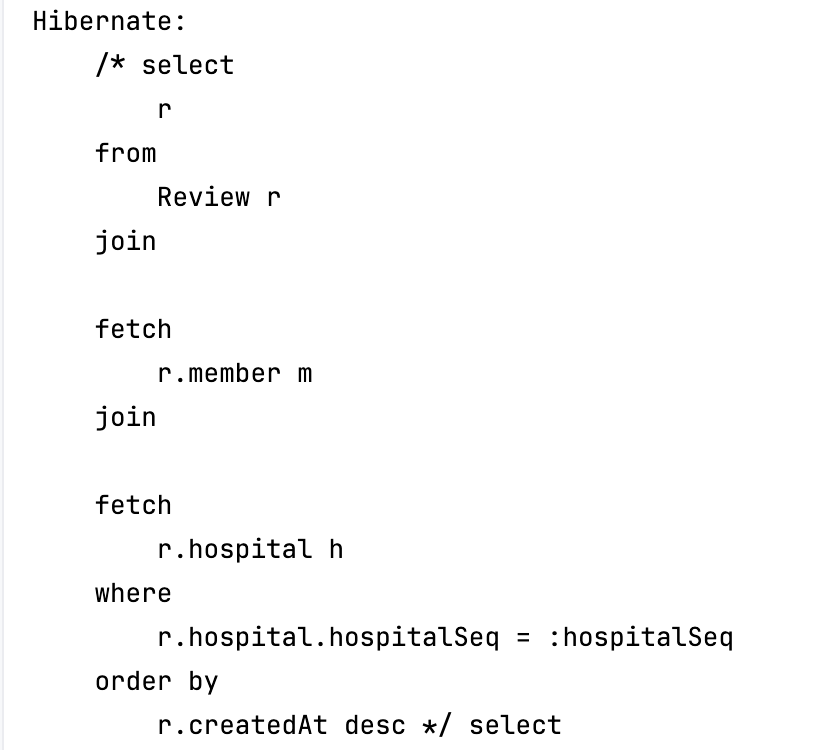 작성된 쿼리와 엔티티의 세팅값을 보면 Review와 Member, Hospital을 조회하는 쿼리만 나가야 정상이다.