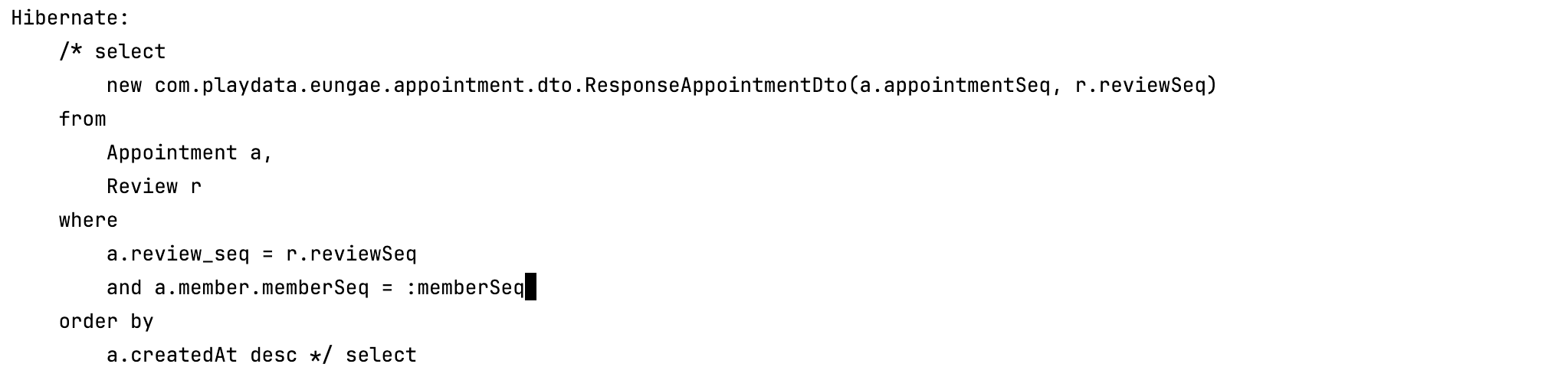 @Query("select new com.playdata.eungae.appointment.dto.ResponseAppointmentDto(a.appointmentSeq, r.reviewSeq)"