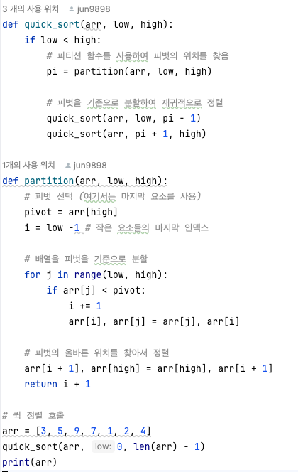 | 단점 | 불안정 정렬 정렬된 배열에 대해 퀵 정렬을 수행하는 경우 O(n^2)의 시간 복잡도를 제공한다. (이러한 문제점에도 불구하고 퀵 정렬을 차용하는 이유는 완전히 정렬된 배열에 대해 퀵 정렬을 수행할 가능성이 매우 적기 때문이다.) |