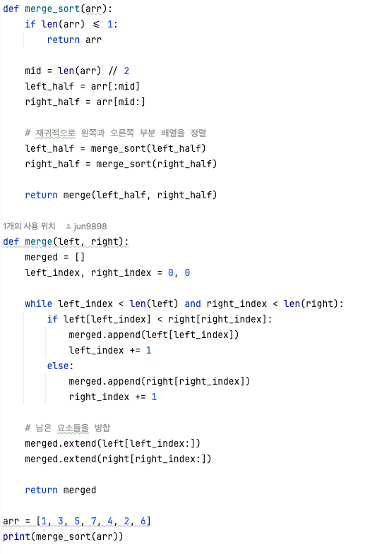 | 단점 | 임시 배열을 선언해야 함으로 추가 공간이 필요하다. (제자리 정렬이 아님) 데이터의 크기가 큰 경우 시간적으로 낭비가 발생한다. |