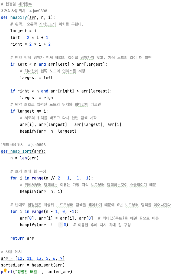 | 정렬 방식 | 기본적으로 힙 자료구조를 사용해 최대, 최소 힙 트리를 작성한다. 그렇게 트리가 작성되면 최상위 노드를 제거하며 정렬을 반복정렬하는 법 |