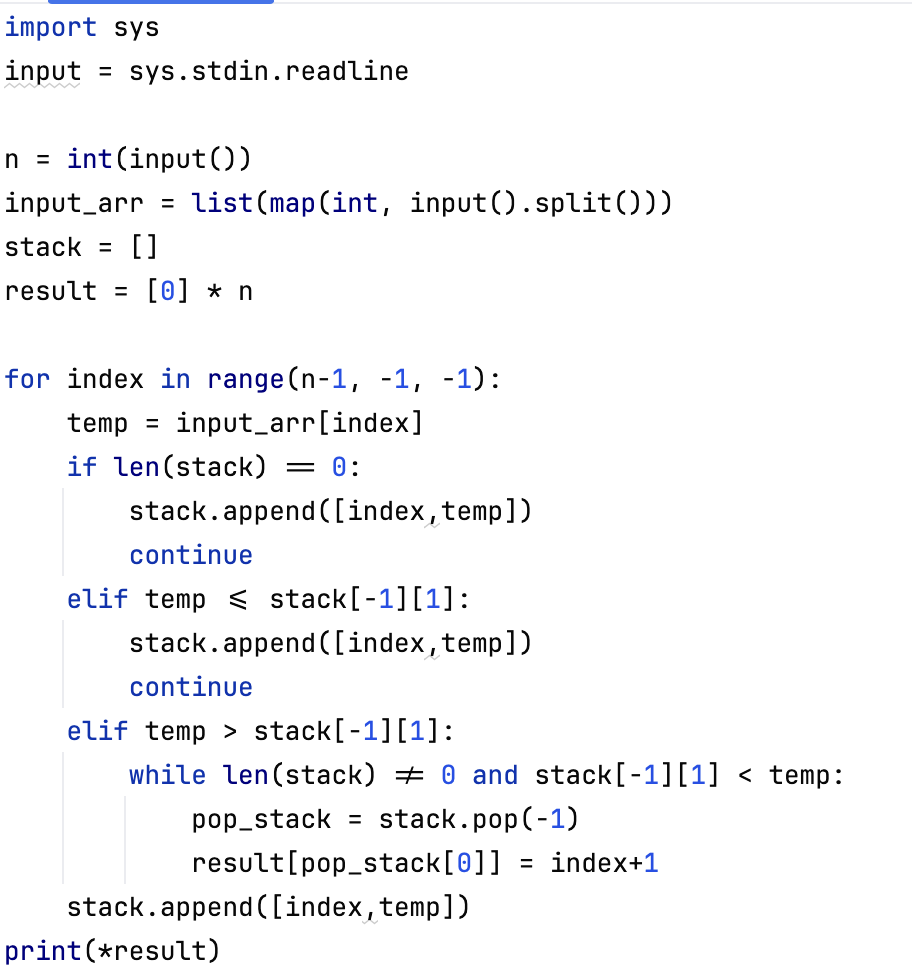 탑의 갯수만큼 배열을 선언하고, 스텍에 탑을 쌓은 뒤, 조건에 부합하면 해당 인덱스에 탑의 위치를 넣어주는 방식으로 해결했다.