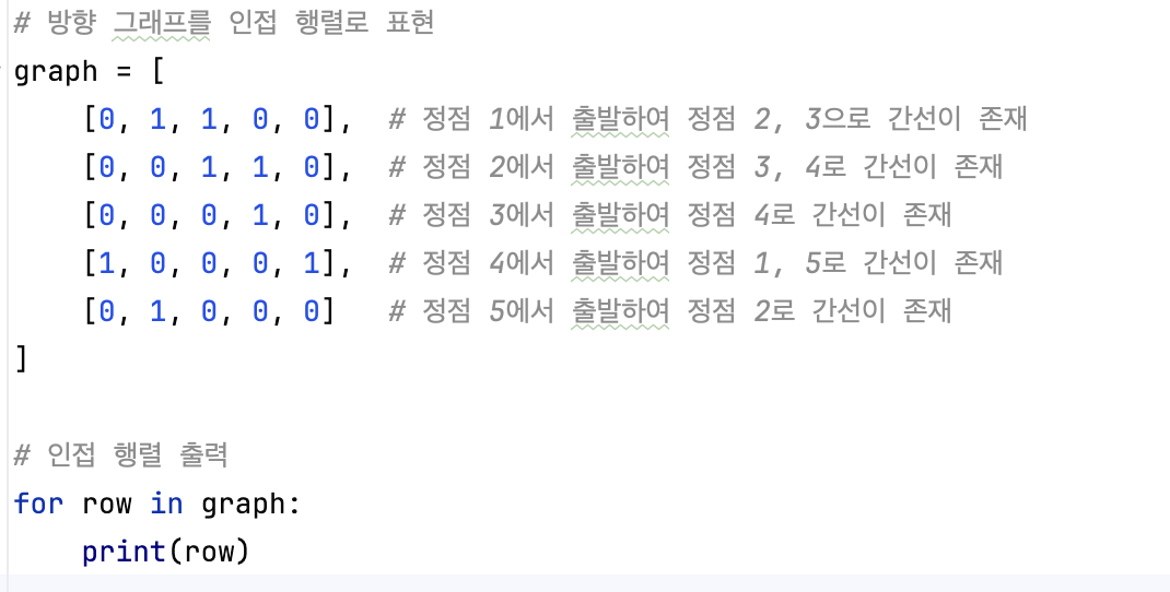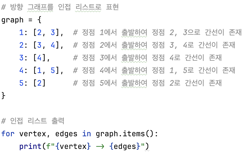 다음과 같은 방향 그래프는 파이썬 코드로 이렇게 구현할 수 있다.