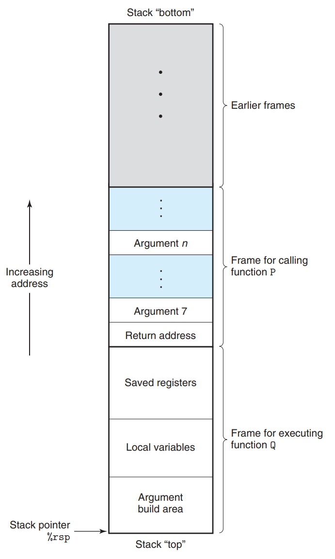 | 스택 데이터의 저장과 추출 | 스택은 기본적으로 선입선출의 구조를 띈다. 스택은 아래 방향으로 성장하며, 스택의 바닥을 가르키는 rbp와 프로시저를 call할때 스택의 현재 위치를 저장하는 rsp가 있음 |