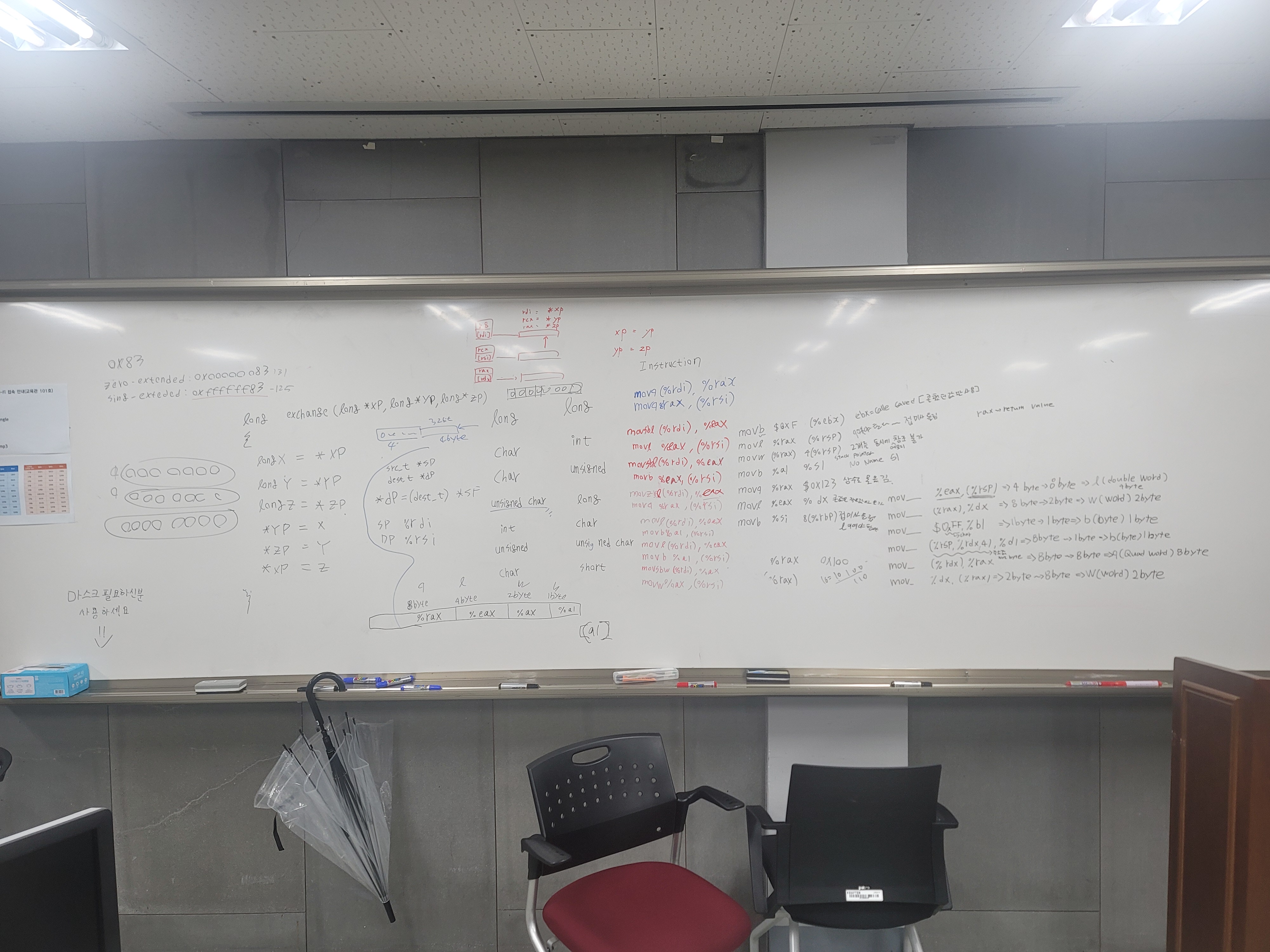 | 데이터 이동 인스트럭션 | movb, movw, movl, movq 네개의 인스트럭션 모두는 값을 옮기는 역할을 하는데, 여기서 뒤에 붙는 접미사는 아까 위에서 봤던 byte의 단위이다. 해당 byte 단위에 유효한 데이터만 옮길 수 있다. |