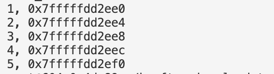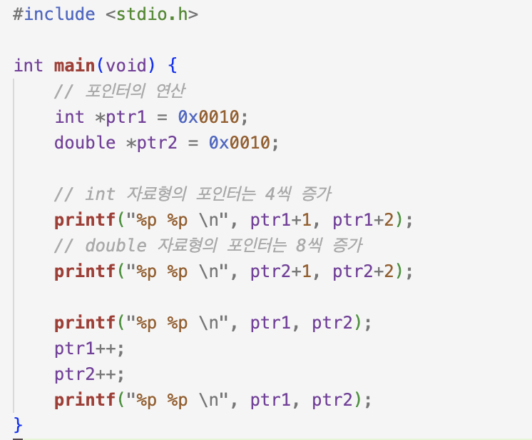 | 포인터의 연산 | 포인터는 가르키고 있는 자료형에 따라 증감치가 다르다. 위 예제를 살펴보면 각각 최초로 저장된 주소에서 해당 자료형의 크기 만큼의 증감치를 가진다는 사실을 알 수 있다. 이러한 특징을 이용해서 다음과 같이 배열에 접근도 가능함 |