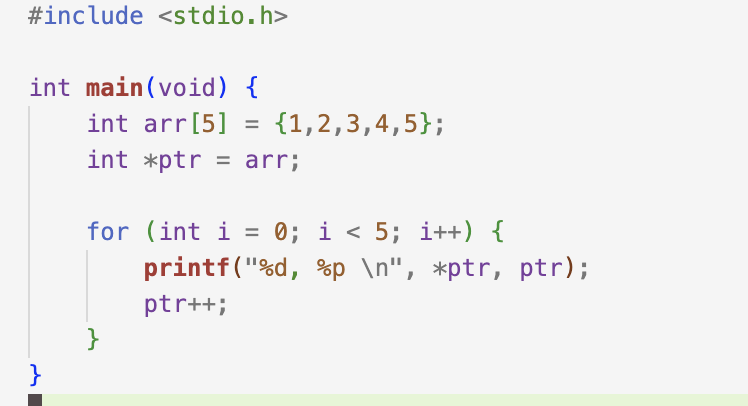 포인터의 연산 | 포인터는 가르키고 있는 자료형에 따라 증감치가 다르다. 위 예제를 살펴보면 각각 최초로 저장된 주소에서 해당 자료형의 크기 만큼의 증감치를 가진다는 사실을 알 수 있다. 이러한 특징을 이용해서 다음과 같이 배열에 접근도 가능함 |