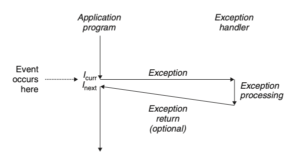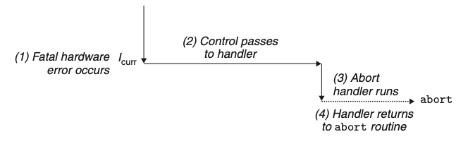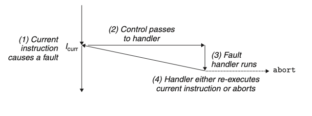 | 오류(fault는 error와 다르다) | 오류는 핸들러가 정정할 수 있는 가능성이 있는 에러 조건으로부터 발생한다. 오류가 발생하며 프로세서는 제어를 오류 핸들러로 이동시켜준다. 만일 핸들러가 에러 조건을 정정할 수 있다면, 제어를 오류를 발생시킨 인스트럭션으로 돌려 주어서 거기서부터 재 실행한다. 그렇지 않다면 핸들러는 커널 내부의 abort 루틴으로 리턴해서 오류를 발생시킨 응용프로그램을 종료한다. |