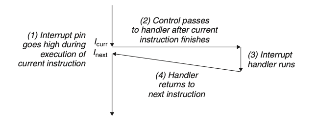 | 인터럽트 | 비동기적으로 발생한다. 특정 인스트럭션을 실행해서 발생한 예외가 아닌, 하드웨어단 작업에서 발생한 예외를 처리하는 방식. 입출력 디바이스들이 프로세서 칩의 핀에 시그널을 보내서 인터럽트를 발생시키고, 인터럽트를 발생시킨 디바이스를 식별하는 예외번호를 시스템 버스로 보낸다. 현재 인스트럭션이 실행을 완료한 후, 프로세서는 인터럽트 핀이 high로 올라갔다는 것을 발견하고 시스템 버스에서 예외 번호를 읽고 인터럽트 핸들러를 호출함 핸들러가 리턴할 때 제어를 다음 인스트럭션으로 되돌려줌 |