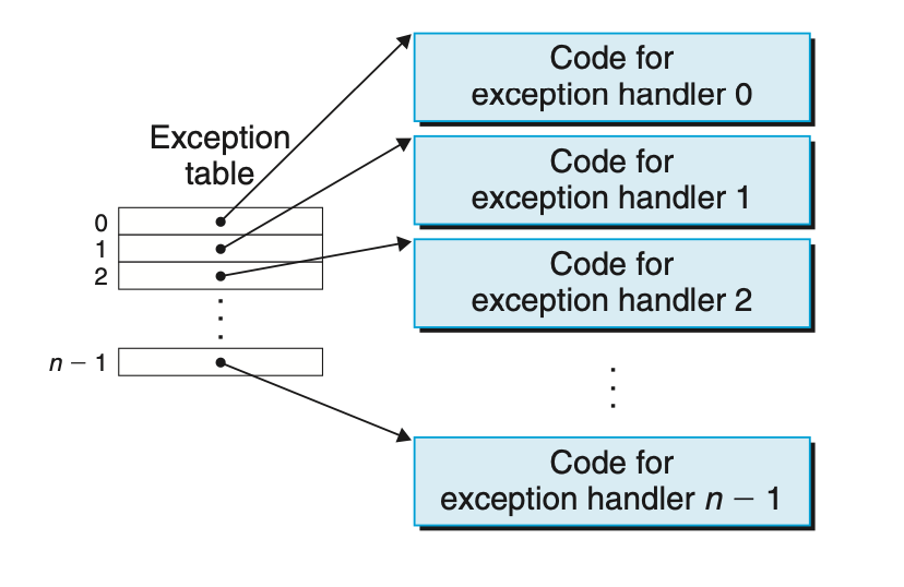 | 예외를 처리하는 방법 | 시스템 부팅시 예외상황의 종류마다 중복되지 않는 양의 정수를 예외번호로 할당하고, 해당 테이블에 해당 핸들러의 주소를 할당한다. 런타임에 프로세서는 이벤트가 발생했을때 예외번호를 결정하고, 이는 예외 테이블의 엔트리 번호가 되어 해당 예외처리 핸들러를 호출한다. |
