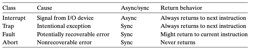 오류(fault는 error와 다르다) | 오류는 핸들러가 정정할 수 있는 가능성이 있는 에러 조건으로부터 발생한다. 오류가 발생하며 프로세서는 제어를 오류 핸들러로 이동시켜준다. 만일 핸들러가 에러 조건을 정정할 수 있다면, 제어를 오류를 발생시킨 인스트럭션으로 돌려 주어서 거기서부터 재 실행한다. 그렇지 않다면 핸들러는 커널 내부의 abort 루틴으로 리턴해서 오류를 발생시킨 응용프로그램을 종료한다. |