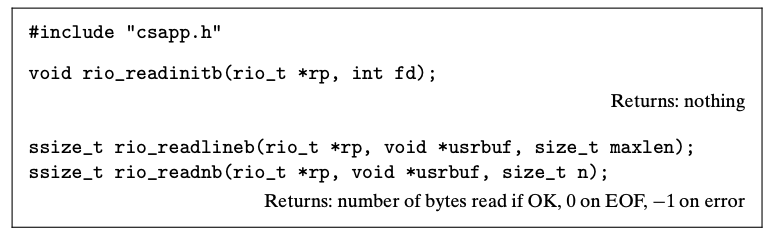 버퍼를 사용하는 입력함수 | 버퍼에 캐시되어 있는 파일의 바이너리 데이터를 효율적으로 읽도록 해주며, RIO 함수들은 같은 식별자에서 임의로 중첩될 수 없기 때문에 thread-safe하다. |