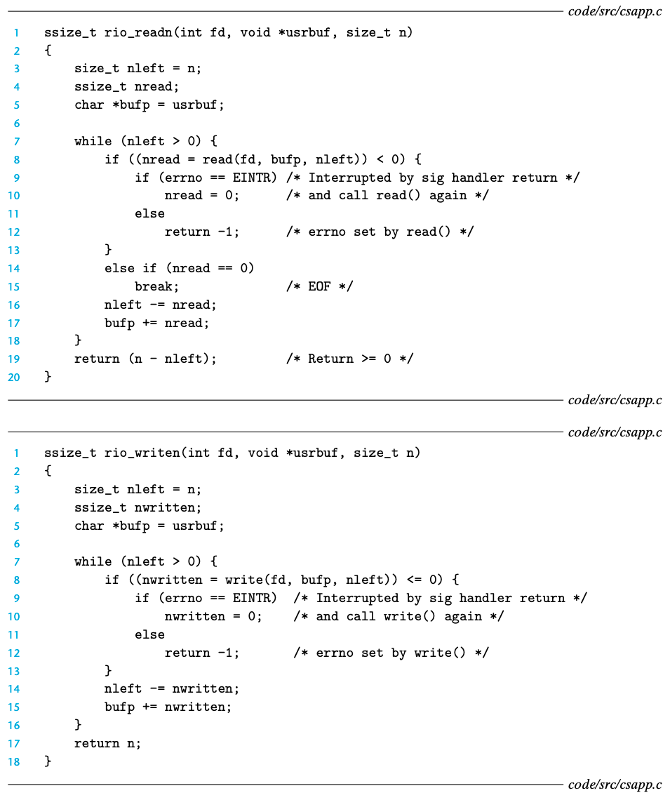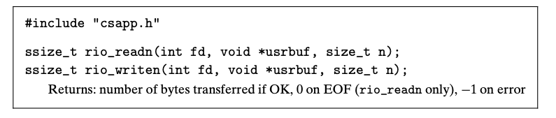 Rio 버퍼 없는 입력 및 출력 함수 | rio_readn 함수는 식별자 fd의 현재 파일 위치에서 메모리 위치 usrbuf로 최대 n바이트를 전송한다. rio_readn 함수는 EOF를 만나면 짧은 카운트만을 리턴하지만 rio_writen 함수는 절대로 짧은 카운트를 리턴하지 않는다. 이 함수들은 같은 식별자에 대해서 임의로 중첩될 수 있다. |