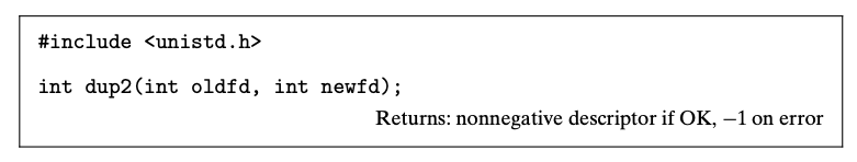 dup2 함수 | 웹에서 CGI 프로그램을 클라이언트 대신 돌릴때, 웹 서버는 fd의 제어를 담당해야 한다. dup2 함수는 식별자 테이블 엔트리의 이전 내용을 덮어 써서 식별자 테이블 엔트리를 새로운 식별자 테이블 엔트리로 복사한다. 약간 제어의 이동이 생각난다 |
