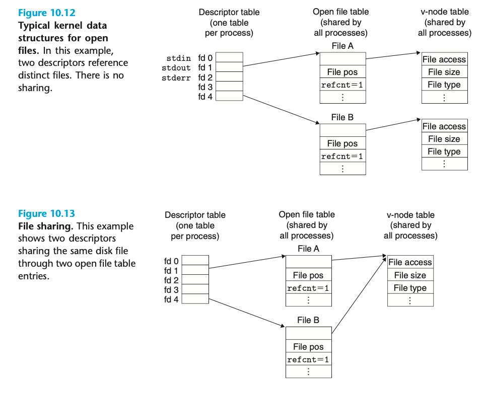파일 테이블 | 파일 테이블은 포든 프로세스들이 공우하는 한개의 파일 테이블을 가르키는데, 각 파일의 위치, 현재 가르키고 있는 식별자 엔트리들의 참조 횟수, V-node 테이블의 엔트리 포인터로 구송된다. 식별자를 닫으면 관련 파일 테이블 엔트리에서 참조 횟수를 감소시키고, 참조 횟수가 0이 되면 파일 식별자 테이블에서 내린다. |