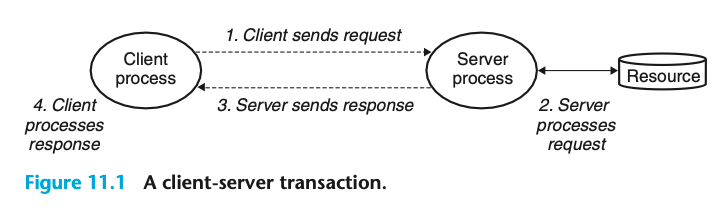 모든 네트워크 응용 프로그램은 클라이언트 서버 모델에 기초하고 있다. 서버는 일부 리소스를 관리하고 이 리소스를 조작해서 클라이언트를 위한 일부 서비스를 제공한다. 클라이언트-서버 모델에서 근본적인 연산은 트랜잭션이다. |