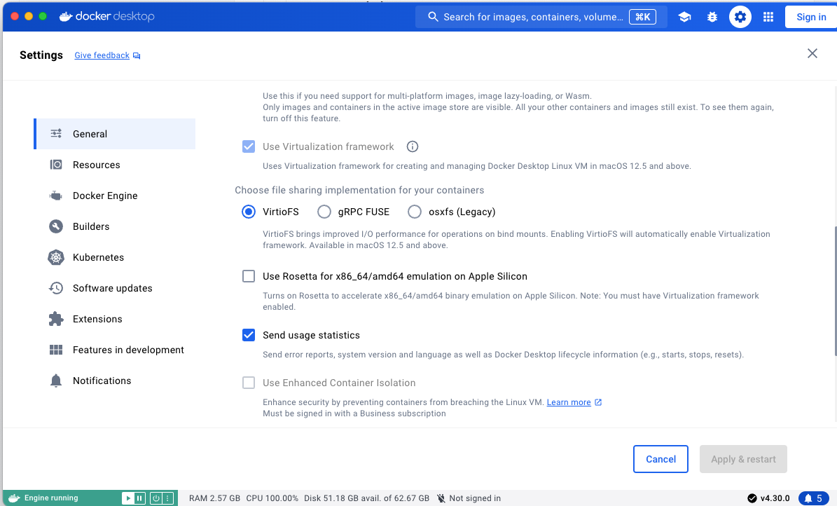 mac의 도커는 기본적으로 Rosetta를 사용하는데 pintOS의 공식 문서를 살펴보면 해당 옵션을 끄고 qemu를 사용해야 한다고 나와있다.