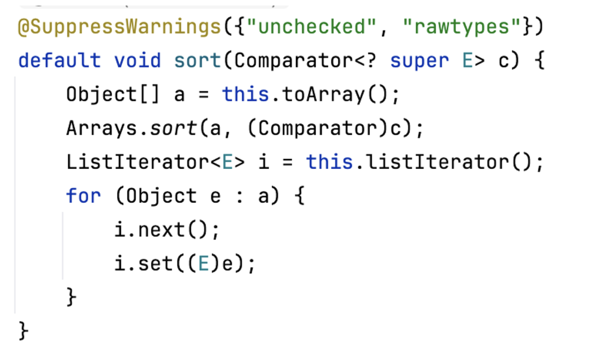 따라서 자바 8 이전에는 List를 구현하는 모든 클래스가 sort를 구현해야 했지만 자바 8부터는 디폴트 sort를 구현하지 않아도 된다.