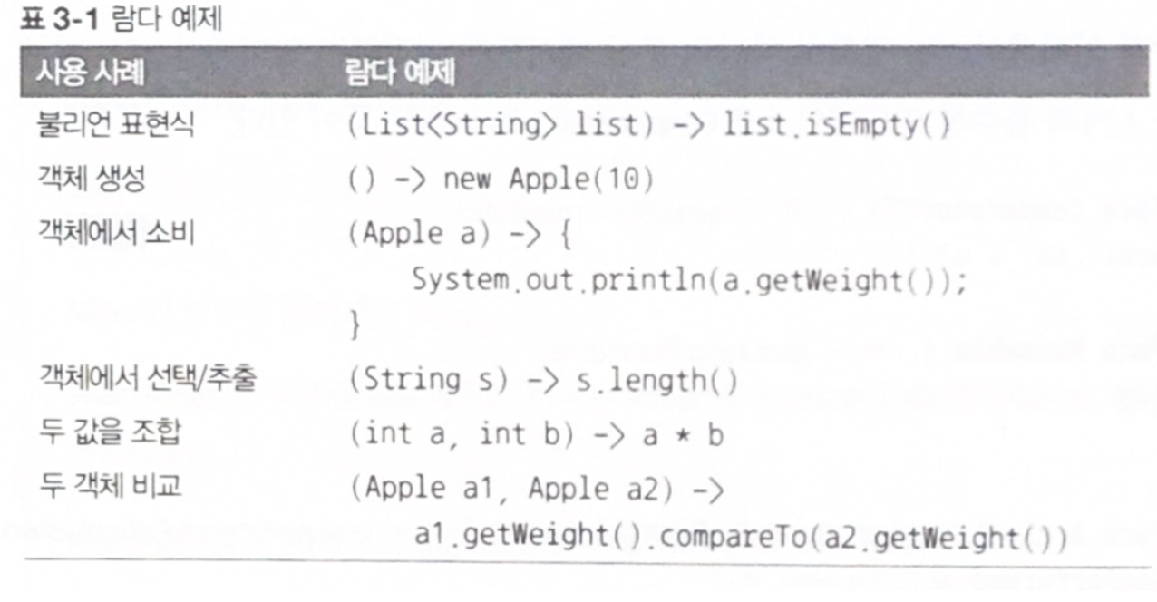 - 람다는 메서드처럼 특정 클래스에 종속되지 않으므로 함수라고 부른다. 하지만 메서드처럼 파라미터 리스트, 바디, 반환 형식, 가능한 예외 리스트를 포함한다.