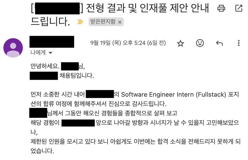 만약 내 역량 부족으로 제안을 받지 못했다면 어쩔 수 없었겠지만, 찜찜함을 남기고 싶지 않았고, 무엇보다 너무 가고싶었던 기업이여서 실례를 무릅쓰고 메일을 전송했다.