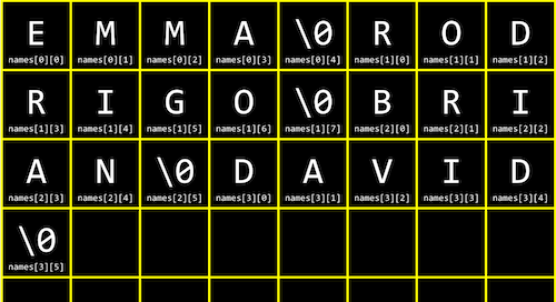이는 names[0][1]과 같이 2차원 배열을 통해 접근할 수 있습니다.