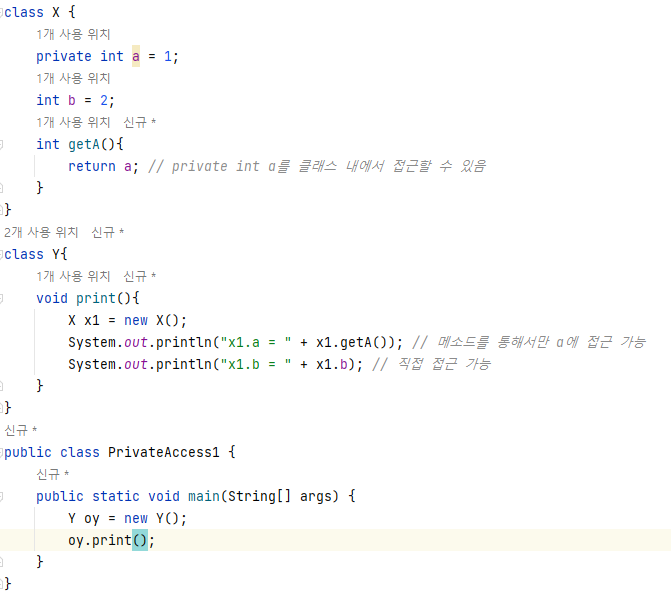 - 클래스, 메소드, 필드, 생성자 정의 앞에 아무것도 붙이지 않으면 default 접근 제한을 지정한 것임