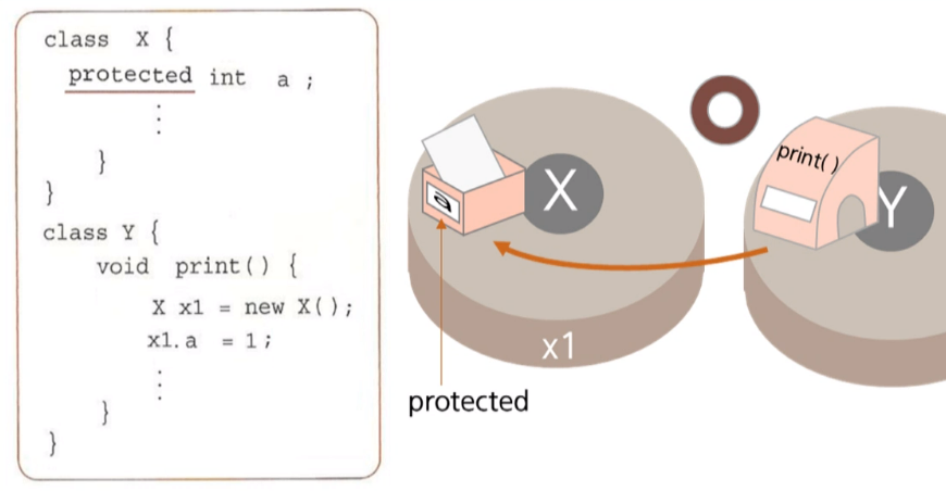 - 다른 패키지에서는 접근할 수 없지만 상속은 가능함(메소드는 오버라이드해서 사용)