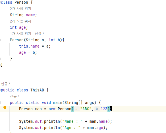 오브젝트 내의 필드와 메소드는 필드 이름, 메소드 이름만으로 이용할 수 있지만, 그 앞에는 this라는 키워드를 붙힘
