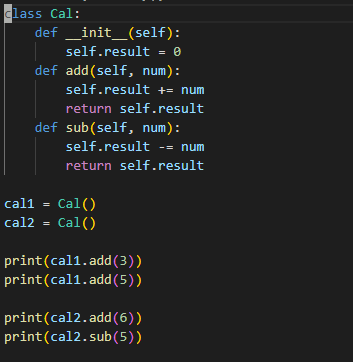 해당 예시를 보면 객체 cal1 과 cal2가 서로 독립된 결과를 print하고 있음을 알 수 있다.