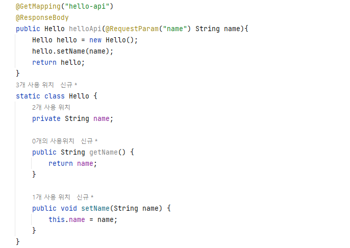 해당 코드는 hello라는 객체를 return하고 있으며 setName 메서드를 사용해서 name값을 지정해주고 있다.