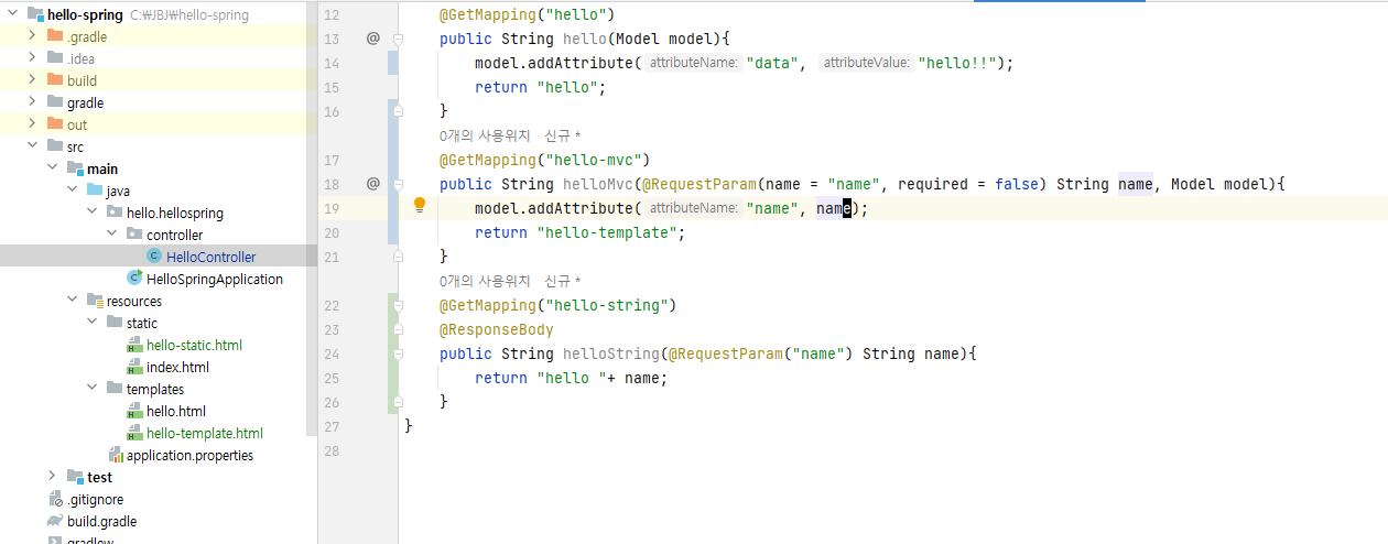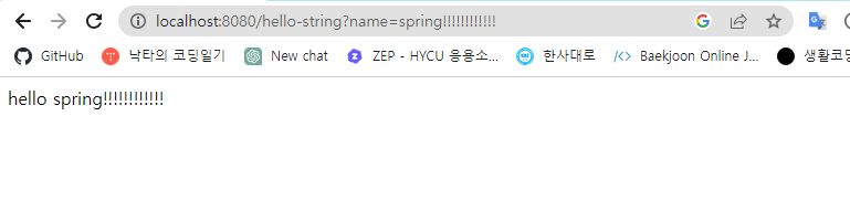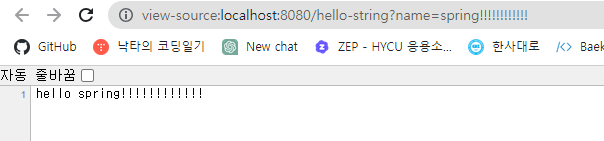 helloString 메서드를 생성해준다. 여기서 주의해야 할 점은 GetMapping 외에 ResponseBody 를 추가해줘야 한다