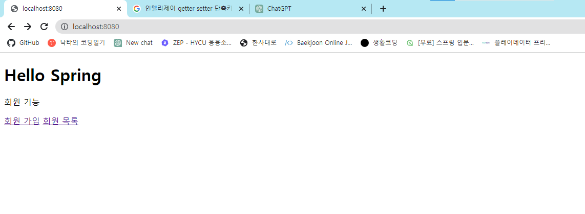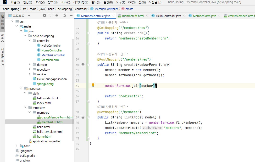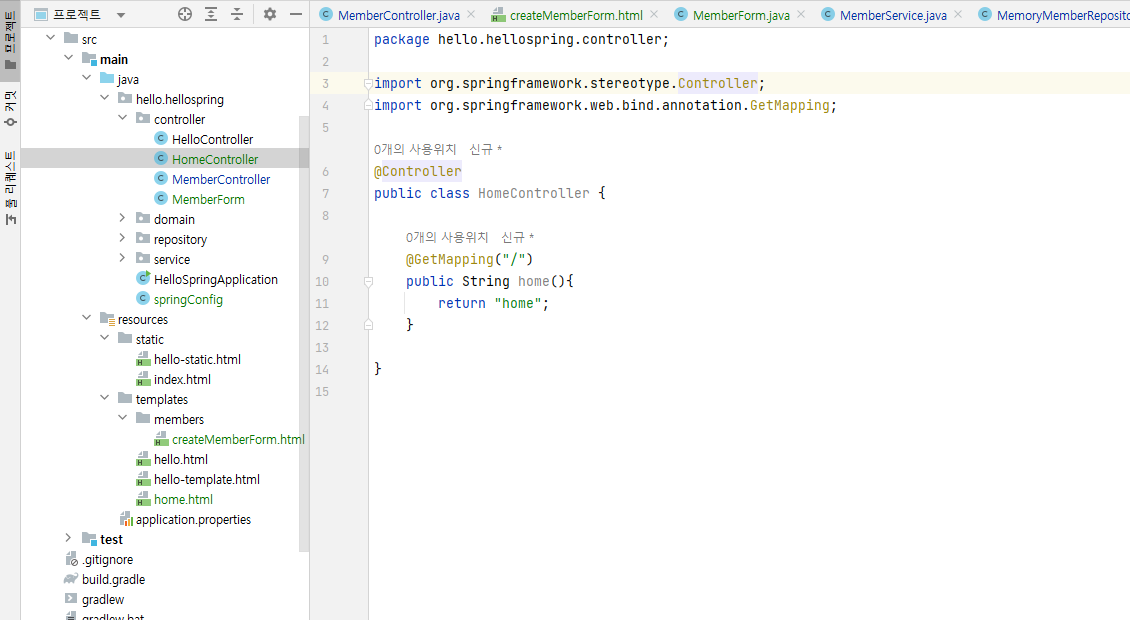 다음으론 회원가입 버튼을 눌렀을 때 /members/new를 호출하고 MemberController에 GetMapping으로 /members/createMemberForm을 연결해준다.