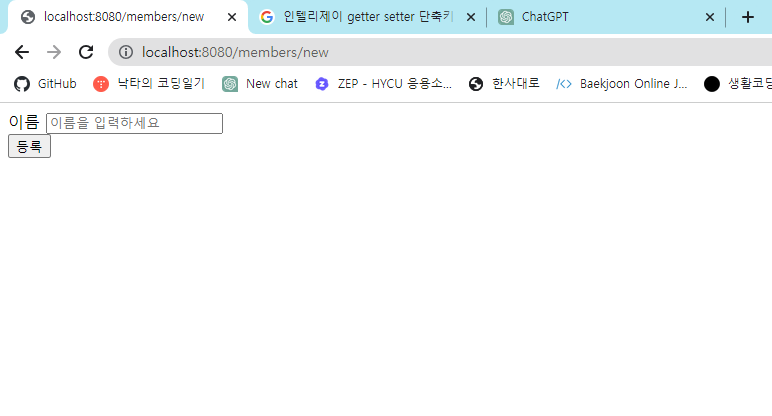 그렇게 호출된 /members/createMemberForm 에서 사용자가 입력한 값은 post 방식으로 넘어온다.