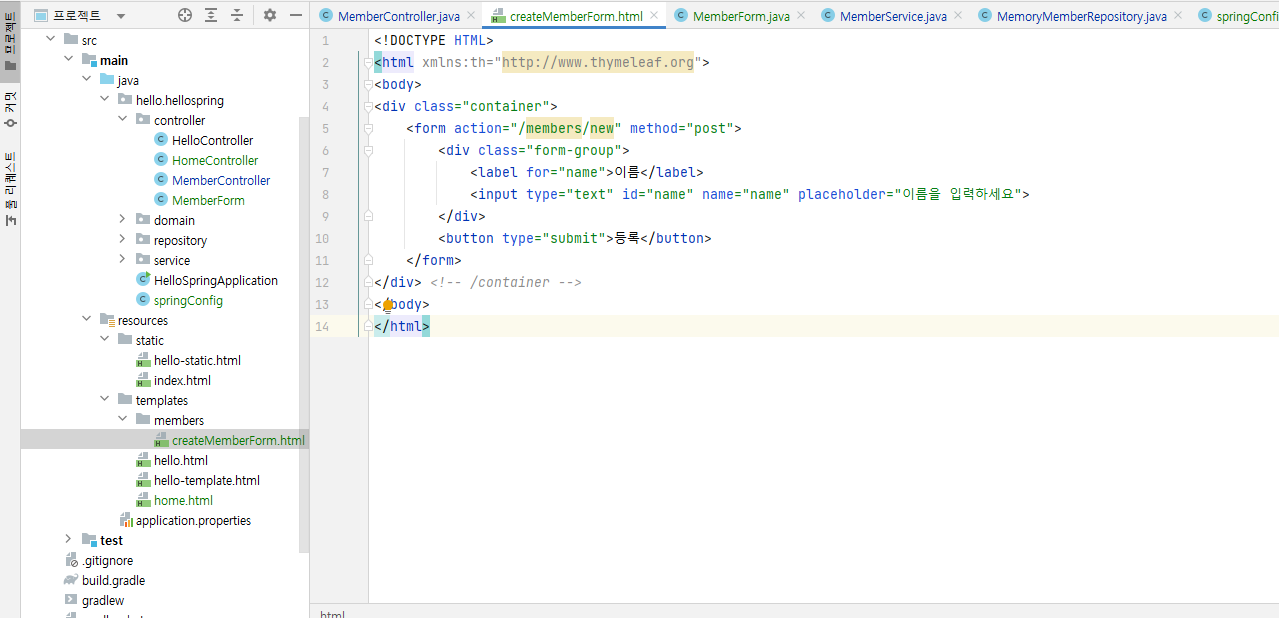 그렇게 호출된 /members/createMemberForm 에서 사용자가 입력한 값은 post 방식으로 넘어온다.
