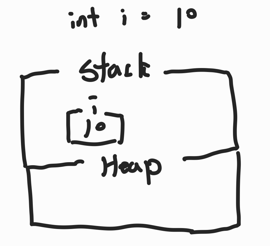 변수를 선언하면 Stack 영역에 해당 변수에 대한 할당공간이 생기고 그 공간에 직접 값을 입력해줄 수 있다.