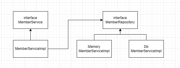 여기서 MemberRepository는 자체 DB를 구축할 수도 있고 외부 시스템과도 연동할 수 있음으로 MemoryMemberServiceImpl와 DbMemberServiceImpl를 객체지향 설계를 바탕으로 구현해둔다.